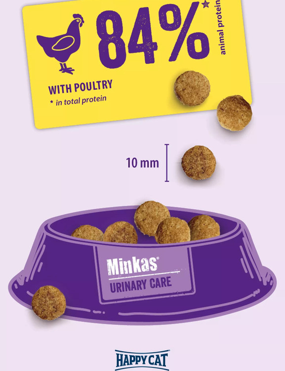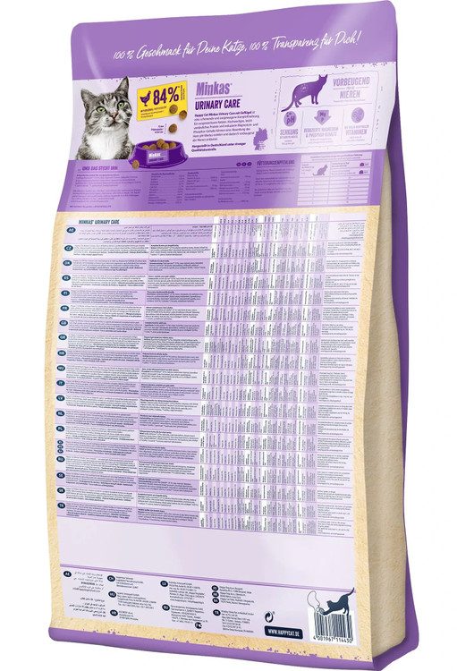 غذای خشک گربه هپی کت مدل مینکاس یورینری (Minkas Urinary Care) حاوی پروتئین تائورین و پروتئین حیوانی با کیفیت بالا بوده و با کنترل pH برای سلامت دستگاه ادراری و مراقبت از دندان بسیار مفید است. هم چنین با دارابودن از اسیدهای چرب امگا 3 و 6 غذایی مفید برای ایجاد پوست و موی سالم می باشد.