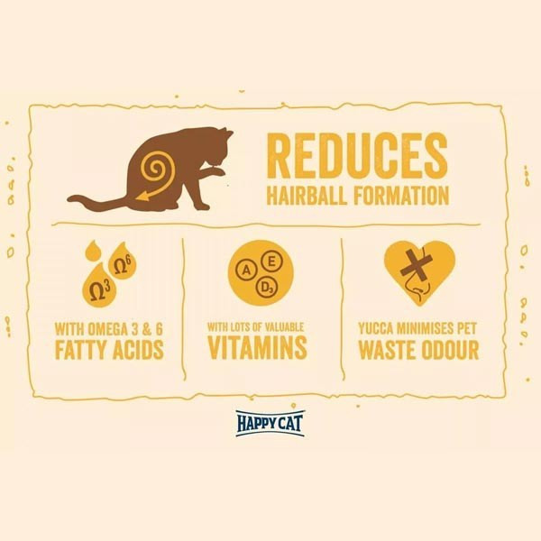 غذای خشک گربه مینکاس هپی کت مدل هیربال کنترل با بسته بندی جدید تهیه شده از گوشت ماکیان (مرغ، اردک و بوقلمون)حاوی 72% پروتئین حیوانی و غنی شده با امگا3 و امگا6 حاوی ویتامین های A,D3,E مناسب برای گربه های بالغ می باشد.غذای خشک گربه هپی کت مینکاس آنتی هیربال به کاهش گلوله مویی گربه کمک می نماید. استفاده از غذای آنتی هیربال گربه هپی کت موجب کاهش بوی نامطبوع مدفوع گربه می گردد.